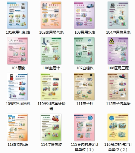 101家用電能表、102家用燃?xì)獗怼?03民用水表、104戶用熱量表、105眼鏡、106血壓計(jì)、107血糖儀、108醫(yī)用三源、109燃油加油機(jī)、110出租汽車計(jì)價(jià)器、111電子秤、112電子汽車衡、113能效標(biāo)識(shí)、114過度包裝、115身邊的法定計(jì)量單位(1)、116身邊的法定計(jì)量單位(2)。